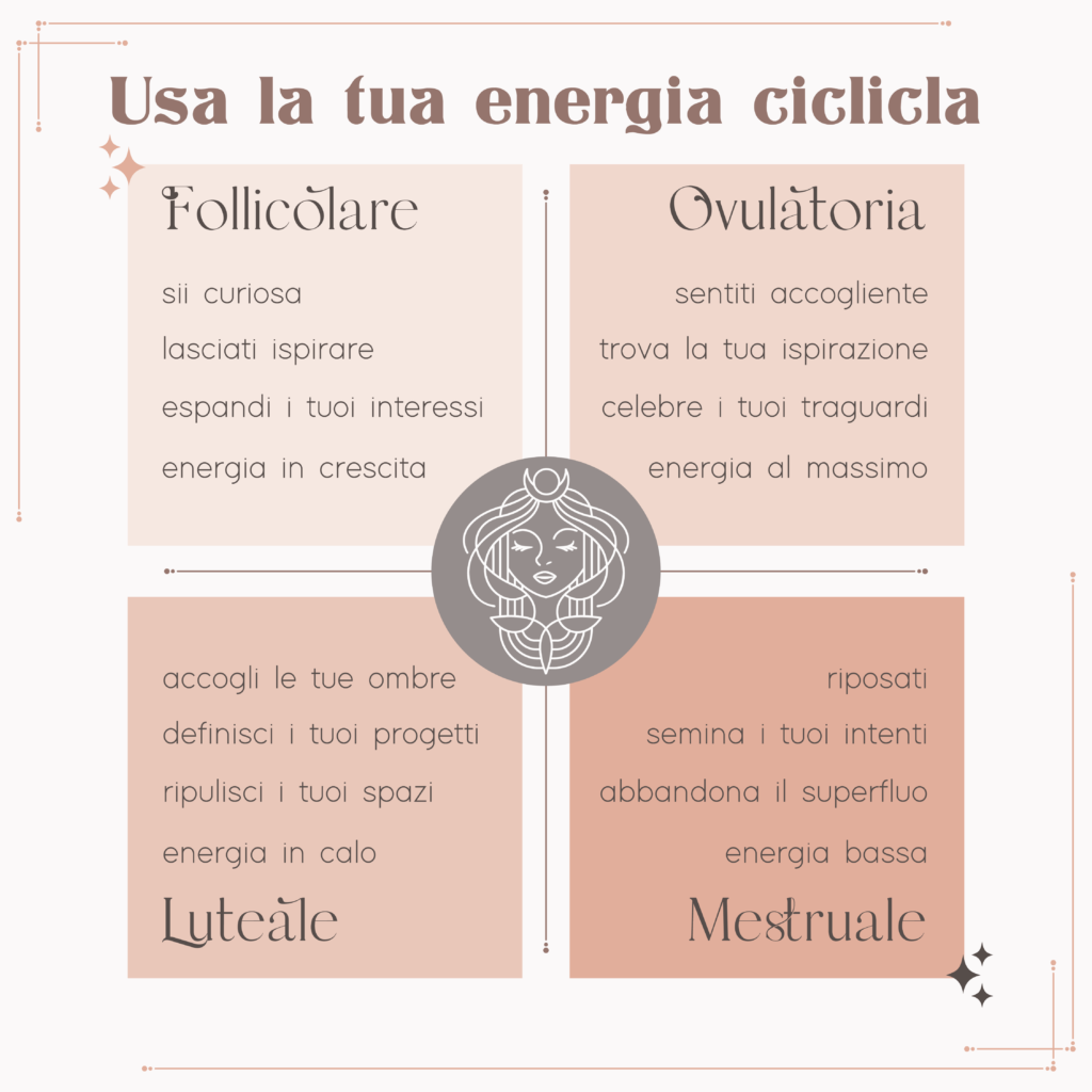 L’energia delle donne non è lineare ma è ciclica, questo significa che ha degli alti e bassi che si susseguono in maniera circolare all’infinito come il passare delle stagioni stesse.